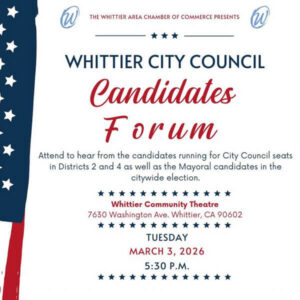 2026 Whittier City Candidates Forum @ Whittier Community Theatre 5:30 pm - 8 pm Tuesday, March 3, 2026 5:30 pm - 8 pm 7630 Washington Ave Whittier, CA 90602 United States https://www.whittierevents.com/events/2026-whittier-city-candidates-forum/