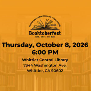 Booktoberfest 2026 @ Whittier Central Library 6:00 pm - 9 pm Thursday, October 8, 2026 6 pm - 9 pm 7344 Washington Ave, Whittier, CA 90602 More Info [apss-share] https://www.whittierevents.com/events/booktoberfest-2026/